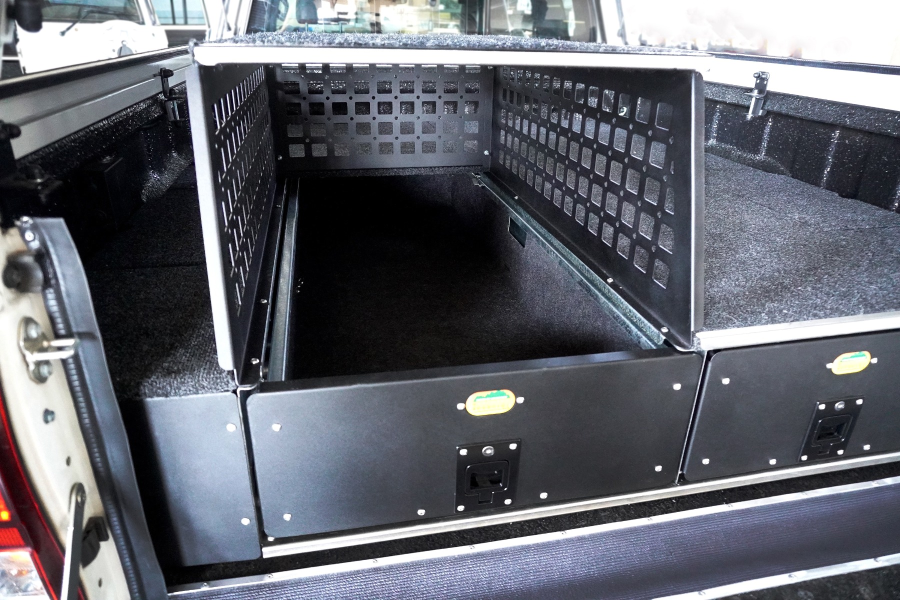 The well known and well proven Big Country Drawer systems have the option to secure your fridge into one of the drawers. Providing a lower acces point than with the use of an fridge slide on top of the drawer system. To maximise the space you would like to be able to use the space above the fridge. This is made possible with the Big Country Fridge Cage.