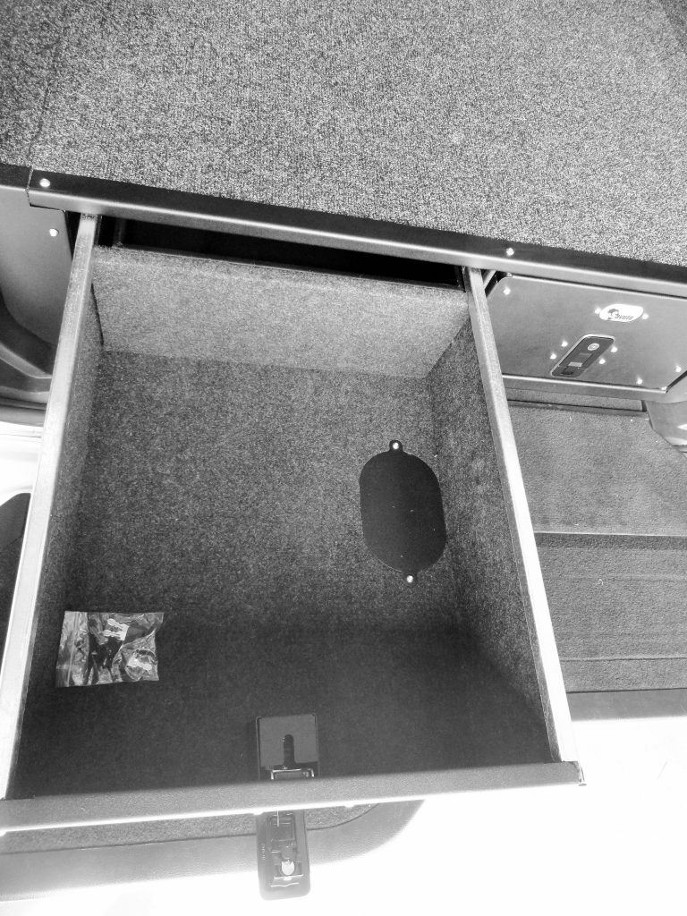 The drawers run on sealed roller bearings and are capable of carrying over 150kg per drawer. The drawers are carpeted inside and on top, have a carpeted face and are lockable.