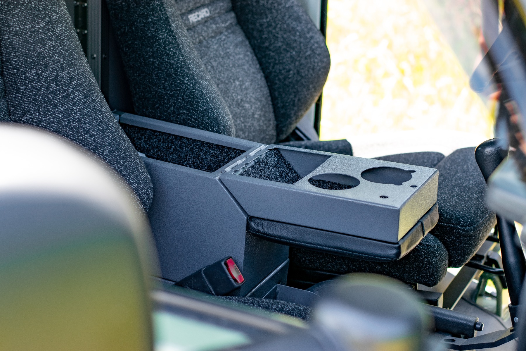 It boasts a hidden safe, a comfortable driving position elbow rest and a fold out drinks holder. We’ve also added a neat little “trinket” box that bolts onto the front of the consol.