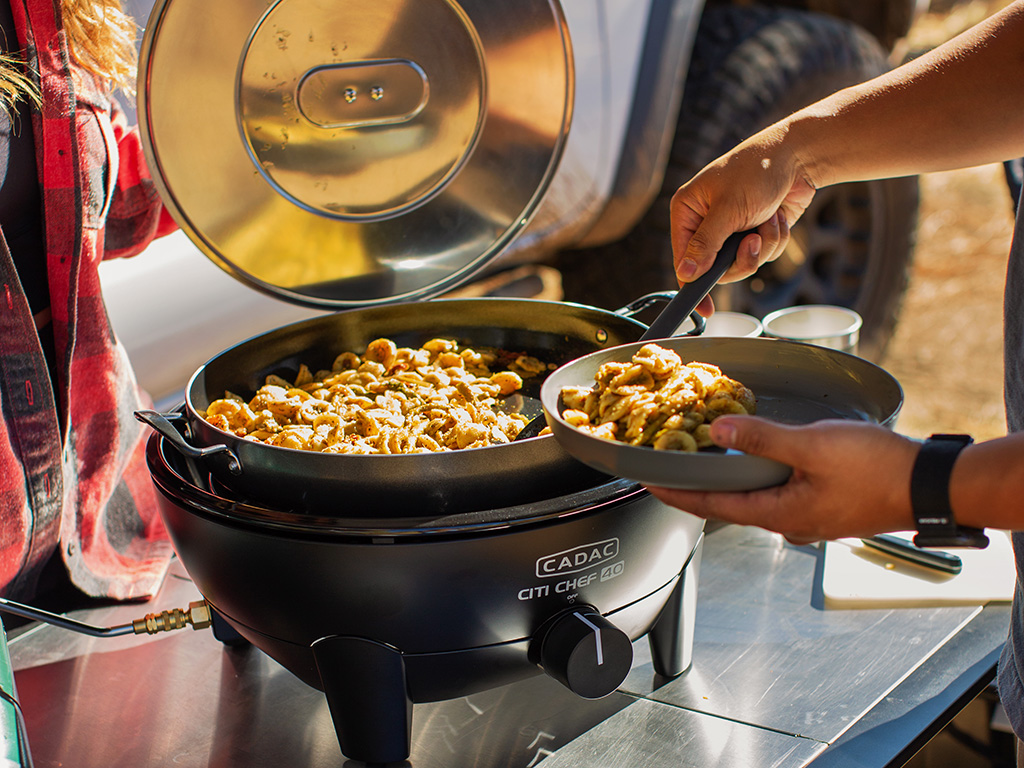 Bereid een storm voor en maak indruk met deze trendy, veelzijdige gasbarbecue. Gemakkelijk mee te nemen naar sportspellen, Nascar en andere buitenevenementen. Met een kookpan, een barbecue en een koepel met een thermometer, is de Citi Chef 40 een gasfornuis voor buiten, in de achtertuin en op het balkon dat een verscheidenheid aan alternatieve kookoppervlakken biedt. Ideaal voor koken in de stad en buiten, het kan ook gemakkelijk worden opgeborgen en vervoerd. De GreenGrill en afwasbare geëmailleerde vetpan (vaatwasmachinebestendig) zijn gemakkelijk schoon te maken en hygiënisch.
