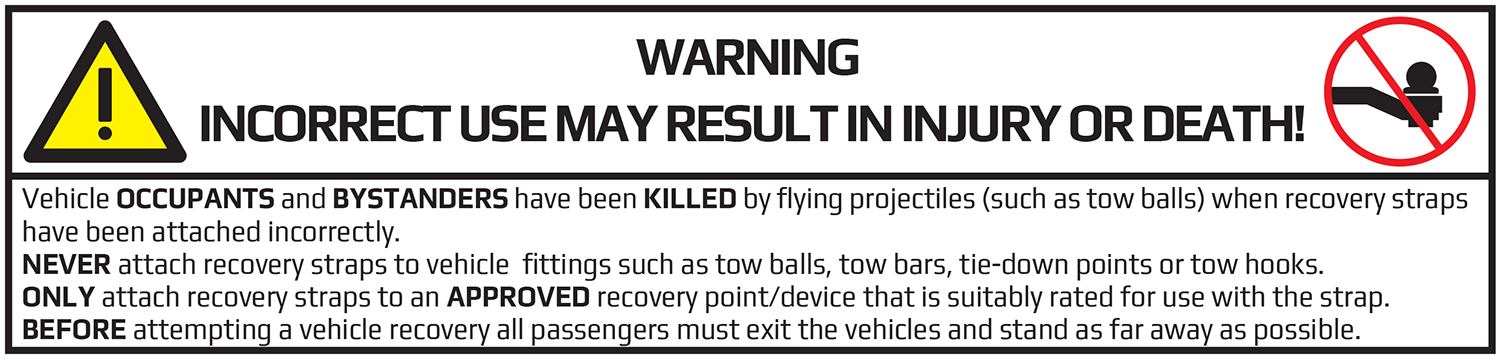 It is recommended that the minimum breaking strength of the strap should be between 2 and 3 times the gross vehicle mass (GVM) of any vehicle it is used with. It is advised that the strap must be suited to the gross vehicle mass (GVM) of the lighter of the 2 vehicles used in the recovery process.