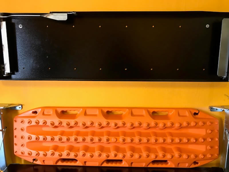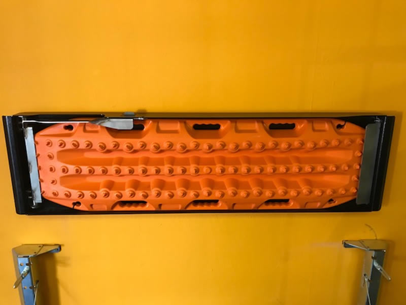This product can be mounted on and surface due to the eight, 8mm mounting holes which double up for drainage. Due to the unique clamping bracket of the Trax Clamp, you can have the sand plates in your hands within 3 seconds without having to unscrew or rattle anything. This means that you can easily access the recovery boards. Additionally, the whole setup can be locked with a padlock (not included but available in our webshop). This way, you don’t have to worry about your recovery boards when leaving your vehicle unattended.